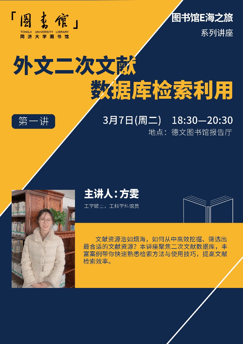 - 你是否正在为如何查找外文文献而苦恼?想要获取更多海外学者的研究成果,但是不知道该去哪里找?文献资源浩如烟海,如何从中高效挖掘、筛选出最合适的文献资源?不用担心,这个讲座将帮助你解决这些问题! 本场讲座聚焦外文二次文献数据库,利用丰富案例带你快速掌握检索方法与使用技巧,提高文献检索效率。不管你是哪个专业领域的学生,这个讲座都将为你提供有用的检索技巧。 快来参加我们的...