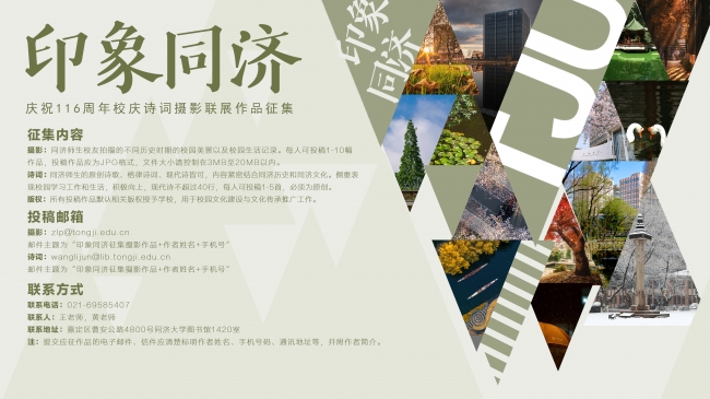- 新学期,“印象同济——庆祝116周年校庆诗词摄影联展”作品征集活动等你来!