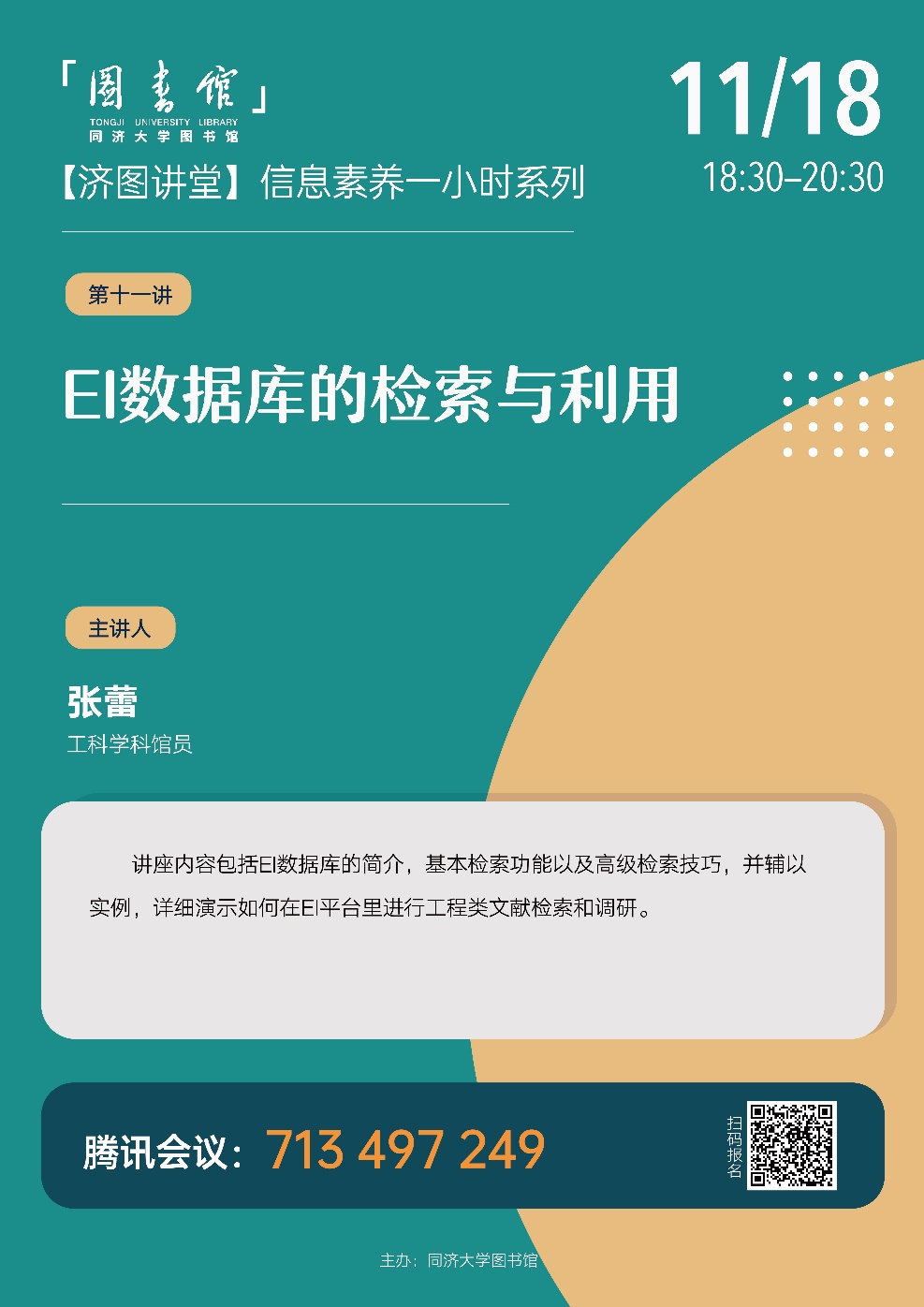 - 我们通常所说的论文被EI收录,EI是指什么?如何利用EI的检索、分析功能为科研提供情报信息?EI提供的信息对工程领域的工作具体起到哪些作用?如何获取EI刊源?如何查询论文被EI收录?本次讲座将为大家解答上述问题,欢迎同学们参加! 讲座主题:EI数据库的检索与利用 讲座时间:2022年11月18日(周五)18:30 讲座形式:腾讯会议 会议号:713 497 24...