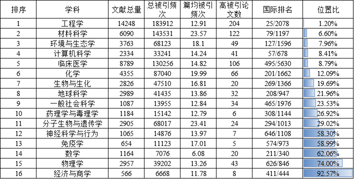 - 据科睿唯安ESI(基本科学指标)数据库2022年11月10日发布的最新数据(数据量统计时间范围为2012年1月1日-2022年8月31日)显示,我校进入ESI世界前1%的学科共有16个,它们是工程学、材料科学、环境与生态学、计算机科学、临床医学、化学、生物与生化、地球科学、一般社会科学、药理学与毒理学、分子生物与遗传学、神经科学与行为、免疫学、数学、物理学和经济与商学。 表:我校进入E...