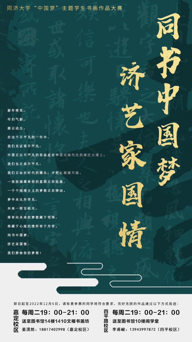 - 活动简介 01 主办单位: 同济大学图书馆 同济大学新生院 承办单位: 同济大学图书馆文榷堂 同济大学图书馆闻学堂 同济大学点墨轩书画社 同济大学教工中国书画协会 02 活动目的 新年将至,年归气新,摇云动尘。在这个不平凡的一年中,我们见证着不平凡:中国正以不平凡的姿态走在中国式现代化的康庄大道上...