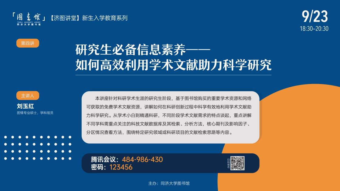 - 各位2022级学术“萌新”们,大家好!【济图讲堂】新生入学教育系列第四讲来啦,此次讲座专为你们而来! 踏踏实实服务国计民生,把论文写在祖国大地上,是同济人共同的使命与担当。作为“学术小白”的你,如何顺利开启学术生涯,成为一名有目标、高效率、有成就的研究生,是亟待解决的问题。 学术研究,万千路径,均由阅读文献出发,如何事半功倍,研究生必备信息素养或许能给你启发。 ...