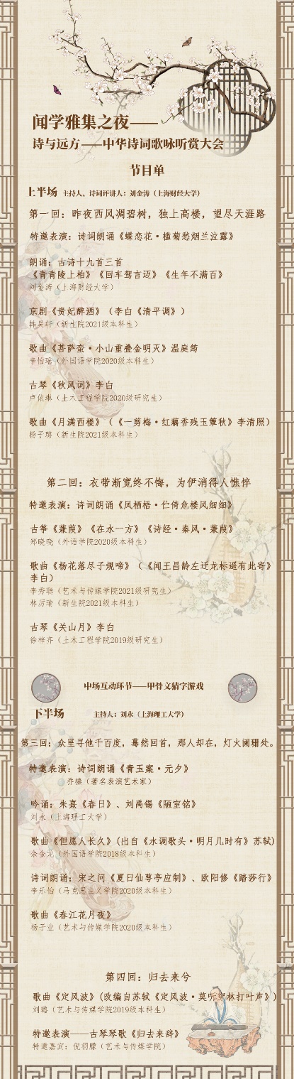 - 闻学雅集堂 诗言志,歌咏言,曲为心声。 那些流传了千百年的诗文名篇,本来就是出自唱和与歌咏。 中华诗词歌咏听赏大会,将传统诗词经典与歌曲,乐曲相结合,吟诵与朗诵相结合,分享传播诗词文辞之美,乐调之美; 中华诗词歌咏听赏大会,挖掘诗词背后的内涵,讲述诗词文化知识、解读人文思想,树立文化自信。 闻学堂雅集之夜,我们重温中华古诗词 用更新、更潮的方式——歌之...