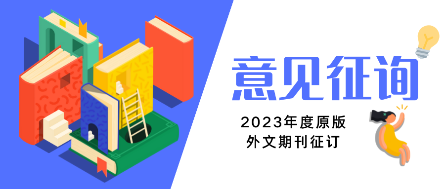 - 各位老师和同学们: 图书馆2023年度原版外文期刊征订工作现已开始,为了满足教学科研需要以及学院学科建设的文献保障需求,合理利用有限的文献采购经费,提高外文文献的利用率,特向广大师生征求订购意见和建议。 请参考我馆2022年图书馆原版外文期刊订购目录来了解图书馆和学院共建(院系分馆馆藏)2022年的外文期刊订购情况。读者可同时参考全文期刊导航与外文期刊电子目录网页来了解我馆...