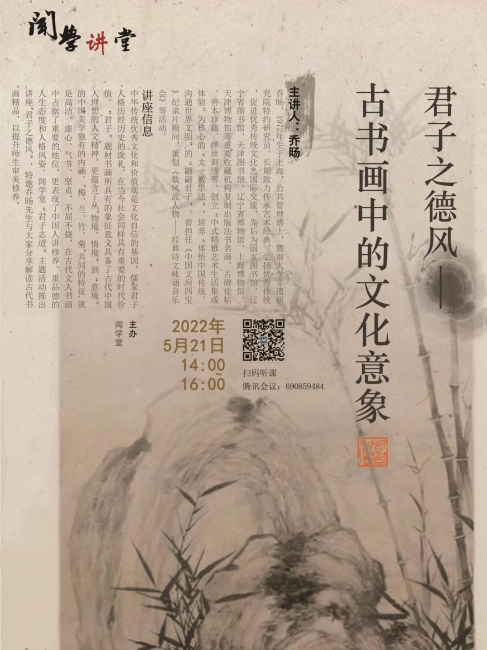 - 闻学讲堂“君子志道”系列讲座 中华传统优秀文化和价值观是文化自信的基因,儒家君子人格历经历史的洗礼,在当今社会同样具有重要的时代价值。“君子”题材书画所具有的象征意义具备了古代中国人理想的人文精神,更蕴含了从"物境、情境”到“意境”的中国美学独有的内涵。"梅、兰、竹、菊"共同的特征,就是正直、高洁、谦逊、百折不挠,在古代文人书画中占据了重要的地位,更表现了中国人讲修养、重品德的人生态度...