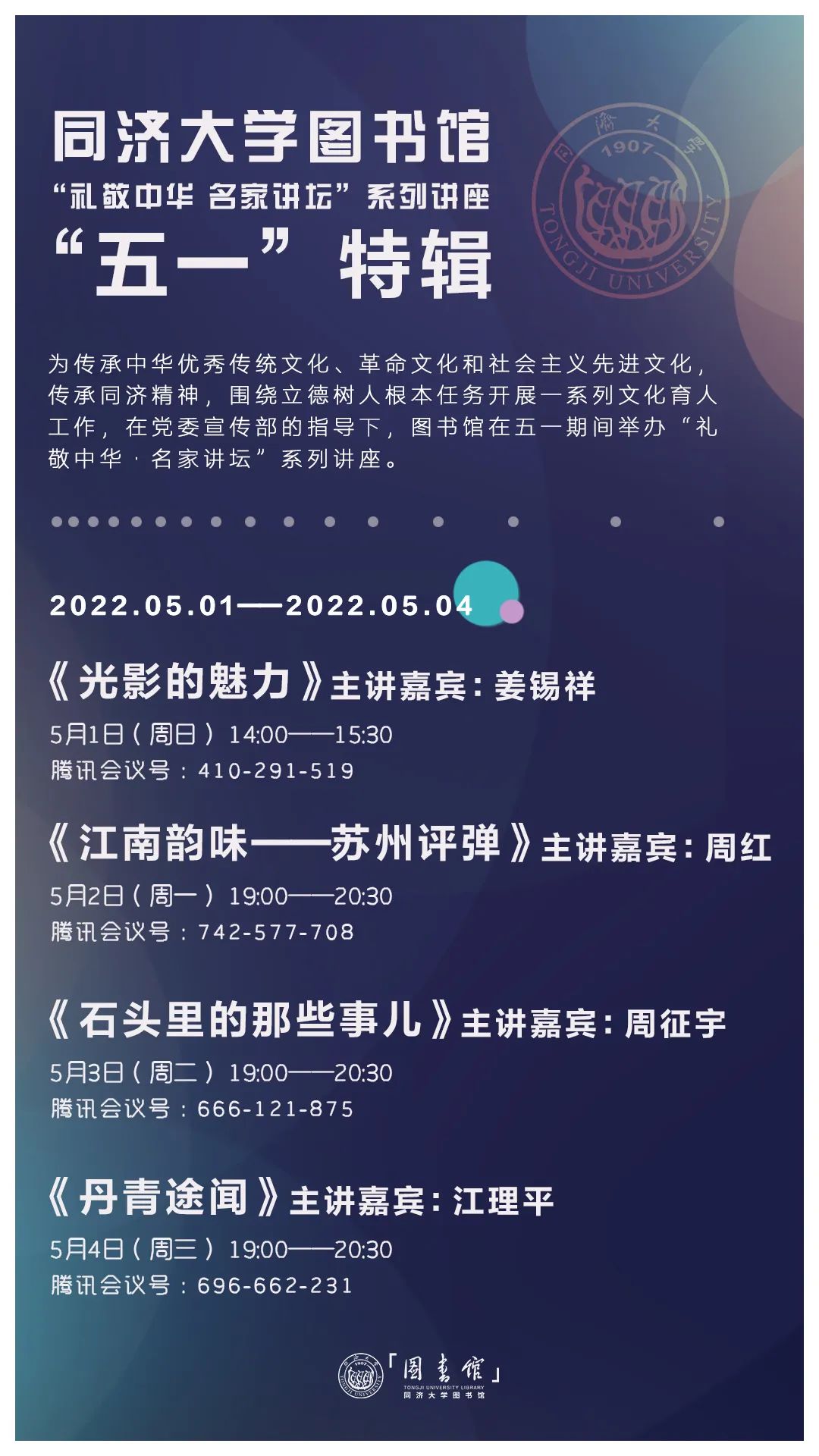 五月的明媚将至 这个假期,你准备如何度过? “礼敬中华 名家讲坛”与您相约云端 5月1日,光影之约 让我们走进摄影的艺术世界 5月2日,评弹之约 让我们品味江南的优雅婉约 5月3日,玉石之约 让我们共赏玉石的前世今生 5月4日,书画之约 让我们聆听翰墨的清雅心音 《光影的魅力》 主讲嘉宾 姜锡祥 讲座时间 20...