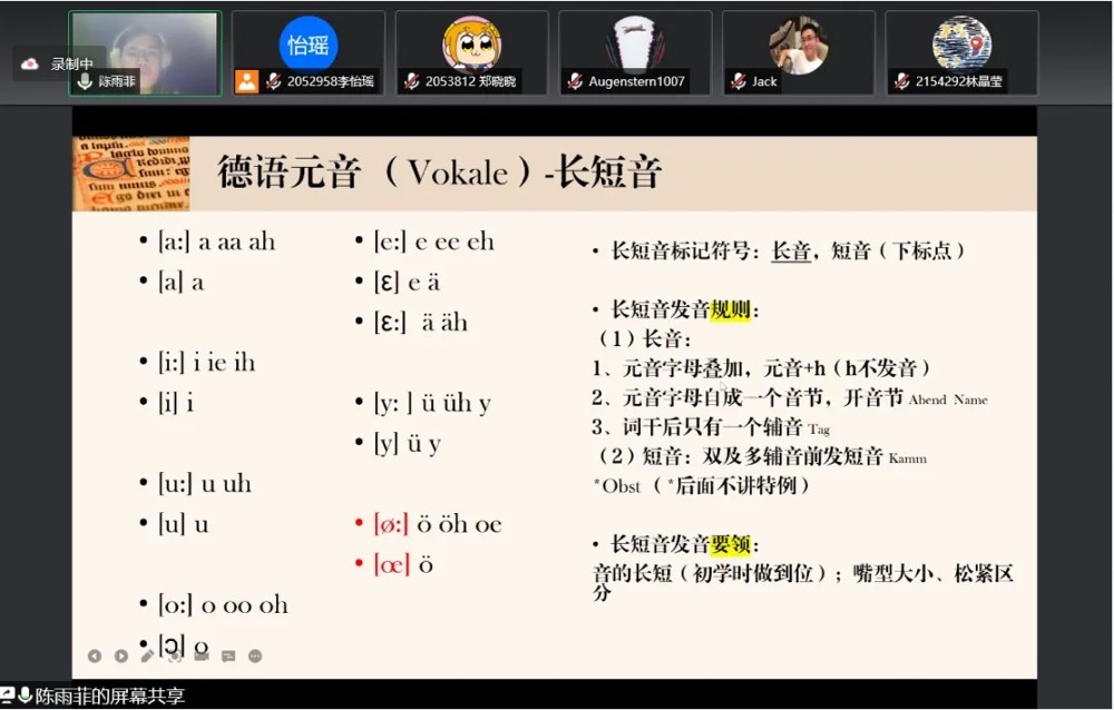 - 德语讲堂第二讲顺利结束,您会开口说德语了吗? 第二次线上课程回顾 学习一门新的语言,自然要从发音入手。德语发音很脆,发音时口腔比较紧张,嘴巴需要时刻保持紧张状态。不知道参加第二讲的同学们是否感同身受:) 4月15日晚,我们的小讲师陈雨菲在线为参与德语学习的同学们准备了满满的干货。从德语的发音特点到德语的发音规则,陈雨菲娓娓道来。 她结合自己的学习经验,建议...