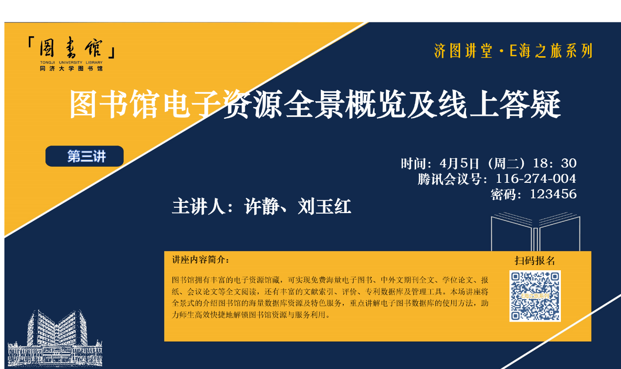 Q:校园封控期间,无法到馆借阅书籍怎么办呢? A:别担心,图书馆有丰富的电子资源可以使用,都是免费的哦~ Q:那我怎么才能找到需要的资源呢? A:4月5号图书馆有场讲座,还有老师在线答疑,我们一起参加吧! 疫情之下,我们的身体虽然只能囿于一隅,但是思想却可以飞往更广阔的空间;疫情虽然阻挡了我们的相聚,但无法阻挡我们学习的热情。图书馆电子资源24小时不打烊,让我们以更充实的生...