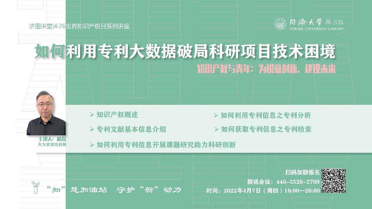 “知”慧加油站,守护“新”动力 你在科研学习中,是否有这样的疑惑: 专利和我有什么关系? 专利在我们的课题研究中发挥作用了吗? 如何获取专利信息? 如何利用专利信息? 专利检索和科技文献检索式一样的吗? 专利分析又可以分析些什么呢? 小伙伴,请看过来~ 讲座简介: 本场讲座首先介绍知识产权及专利文献信息的基础概念,讲述专利...