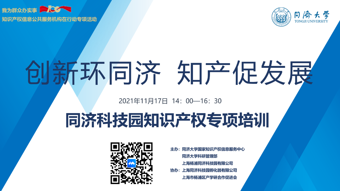 为充分发挥知识产权信息在创新发展中的重要作用,激发中小企业创新活力,贯彻落实国家知识产权局“知识产权信息公共服务机构在行动”的专项活动要求,推动“我为群众办实事”实践活动走深走实,同济大学(国家)知识产权信息服务中心、同济大学科研管理部联合上海杨浦同济科技园有限公司、上海同济科技园孵化器有限公司、上海市杨浦区产学研合作促进会,共同开展主题为“创新环同济,知产促发展”的线上知识产权专项培...