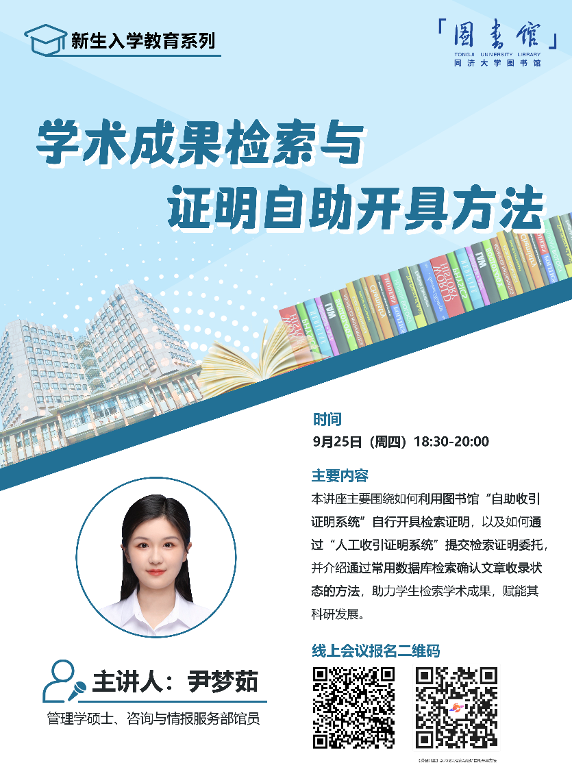 - 还在为成果检索证明排队跑腿,论文收录状态总让你一头雾水? 想要足不出户就能玩转学术认证,把时间真正还给科研创新? 那就快来get图书馆“论文收引证明”新技能吧! 告别繁琐流程,拥抱自主科研——我们从“证明自由”开始! 讲座时间:2025年9月25日(周四)18:30-20:00 讲座形式:线上腾讯会议(会议号:786290482,密码:报名...