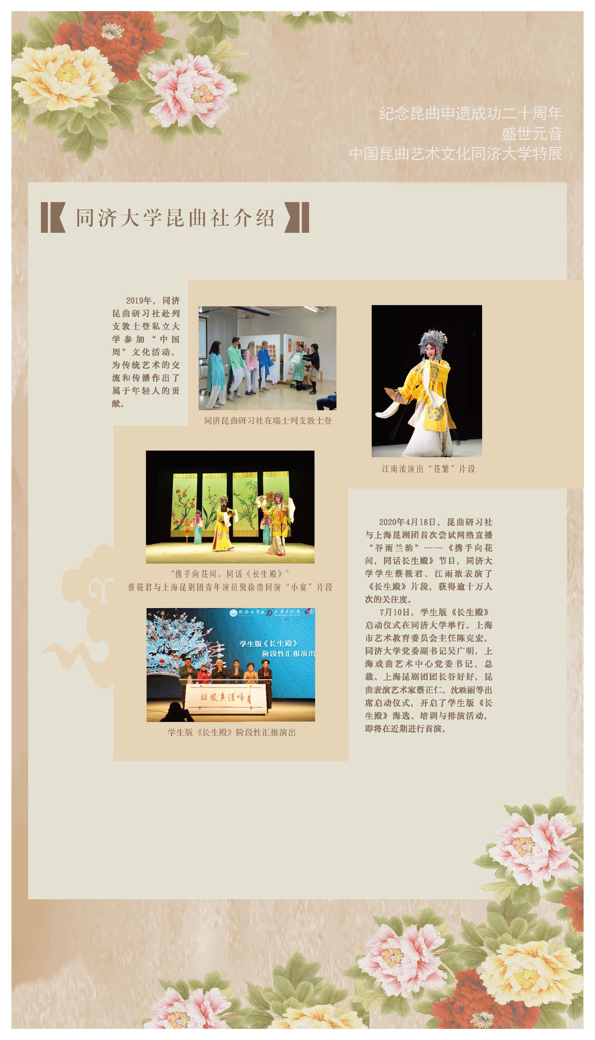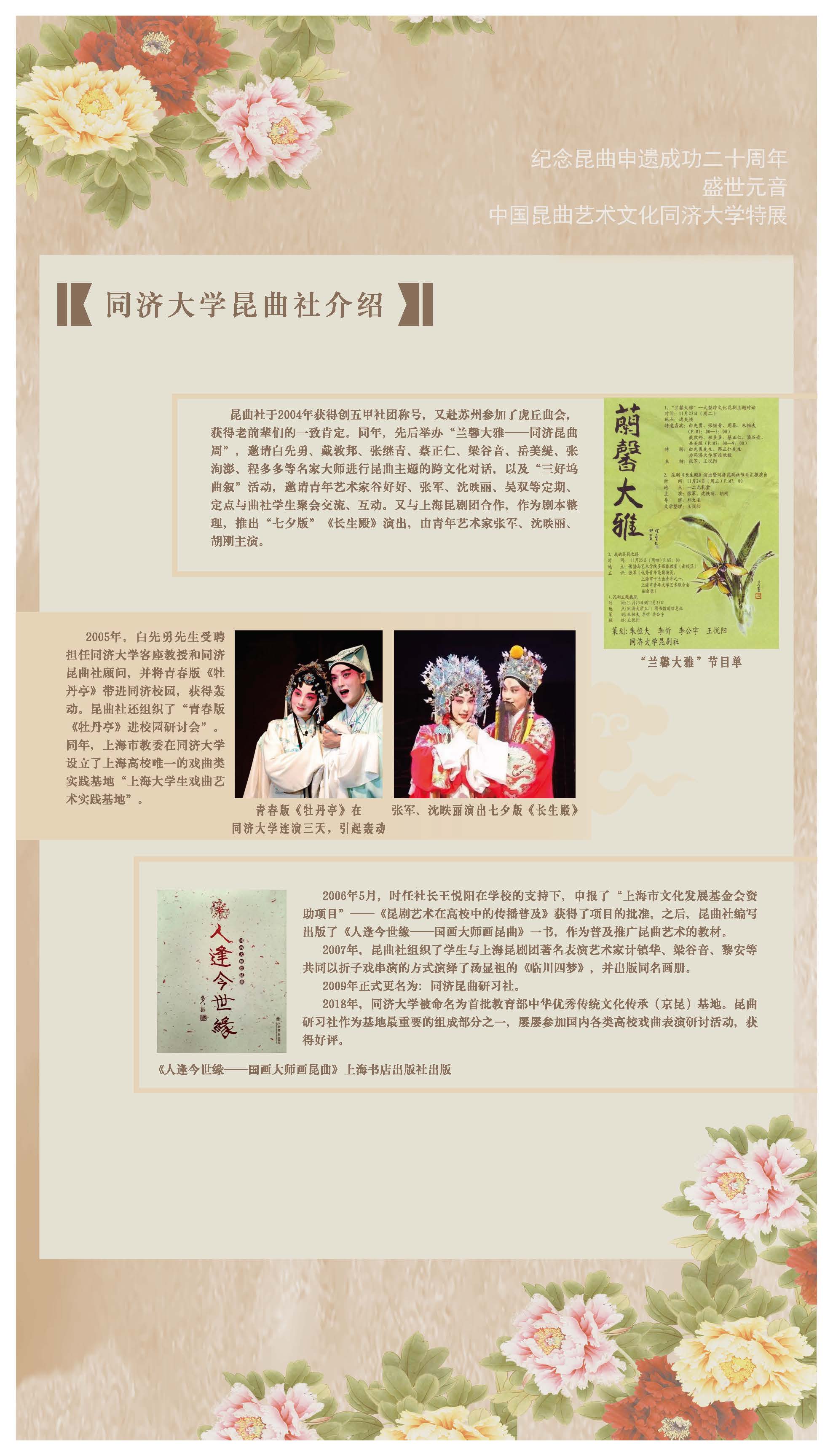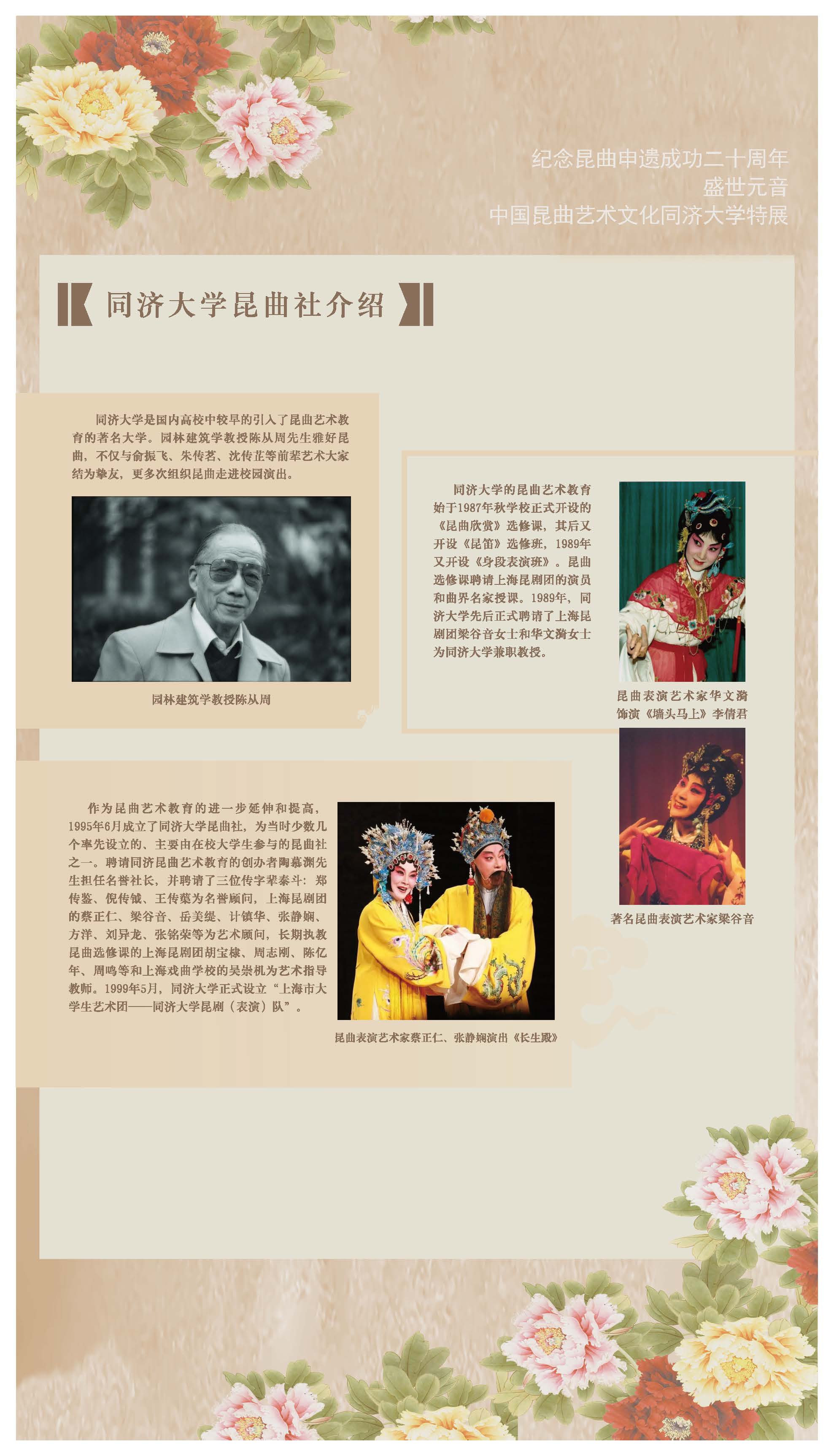 在纪念昆曲申遗成功二十周年之际,同济大学和中国昆曲博物馆联合举办了这个展览。展览用展板、展品、灯箱、模型、视频和画册等多种形式组成的展览,希望通过展览讲述的有关昆曲发展600多年来的历史、人物和重大事件的一个个生动的往昔故事,在表达昆曲的厚重积淀和盛衰演变的同时,也向昆曲的前辈们致敬。并希冀青年学生们通过这个展览,进一步了解中国戏曲艺术的伟大成就,从而可以更好地传承中国优秀的传统文化。