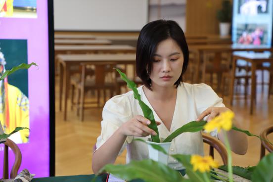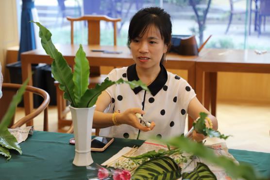 海派插花在中国传统插花的基础上进一步创新,体现了上海特点、时代特征,已经正式入选第六批上海市非物质文化遗产代表性项目名录。二十四节气(24 solar terms),是中国人根据地球在黄道的位置变化而制定的,通过观察太阳周年运动,认知一年中时令、气候、物候等方面变化规律,在2016年11月30日被正式列入UNESCO人类非物质文化遗产代表作名录。在本次海派插花课程中,海派插花非遗传承人魏语萱以“二十四节气与插花”为主题,从二十四节气的背景知识、二十四节气对应的花卉、插花技巧几个方面与参加活动的教师进行了交流,并现场示范,教大家制作了精美的瓶花倾斜型插花作品。