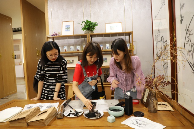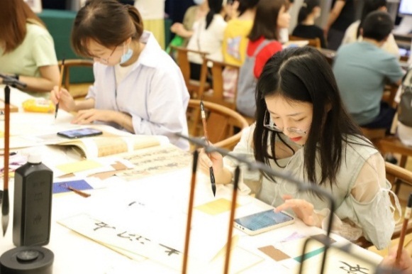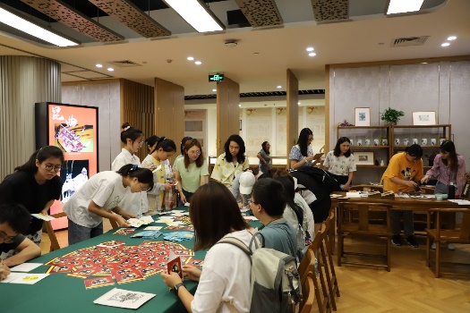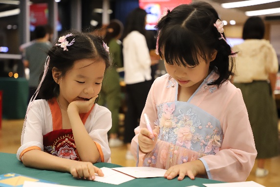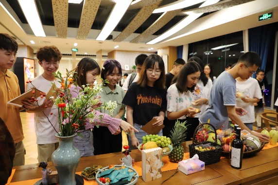 签到区的雅赏卡和飞花令对,可以让师生手写祝福、心愿或者填写飞花令卡,投入抽奖箱还可参与抽奖,送出了文榷堂的文创礼品。 一张亲自拓印的藏书票,一段尽管生涩却动情的琴音,和自己亲手写下的书签和祝福语,使师生们在文榷堂感受了不一样的中秋节。来自电子信息与工程学院本科生法子萱同学表示,“秋风送爽,金桂飘香。远在他乡为异客的我却在文榷堂体验了别样的中秋节。秋夕雅赏,赏桂花、赏古琴、赏书法,载着我的思乡之情,一同徜徉在圆月清晖之中” 。艺术与传媒学院研究生余珺珺同学表示:“第一次在学校里过中秋,和一群萍水相逢的同学们一起分享瓜果、月饼,喝桂花蜜酒,还一起体验了木版水印,古琴弹奏,并亲手提笔写了书法为家人朋友寄托祝福。人有悲欢离合,月有阴晴圆缺,聚散自有时,团圆终可期,尽管离家千里,但这个夜晚也抚慰了我那颗思乡的心。”