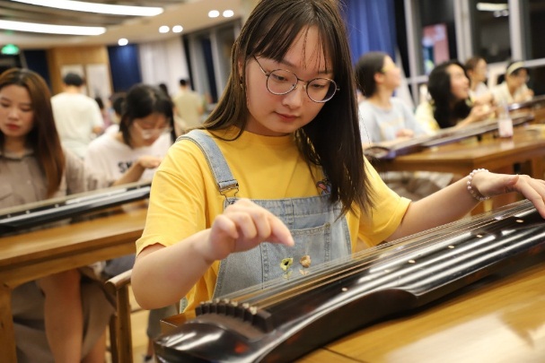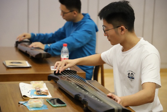 在“秋夕月宴”环节,文榷堂为师生布置了品茶,闻香、插花等中秋传统文化的体验,大家可以领取特色月饼,品尝瓜果,体会在校园里团聚的温馨。奠桂椒浆由老师为大家讲解桂花与中秋文化,师生在赏诗、赏花、赏画的时候,还可以品尝桂花茶、桂花酒和桂花糕。“琴音入怀”邀请了著名古琴演奏家、管平湖嫡传弟子乔珊老师的学生、独立拉丝古琴讲师和演奏者高雪娇教大家现场弹奏古琴曲。随着同学们现学现奏的《沧海一声笑》旋律响起,古琴的旋律宛若山涧风铃,似潺潺溪流,使大家陶醉在中秋夜的静雅之中。