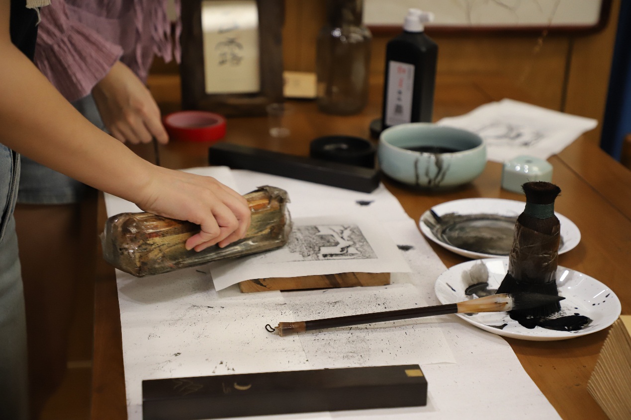 木版水印体验区是国家级非物质文化遗产木版水印项目传承人、文榷堂指导老师魏立中为文榷堂定制的木版水印藏书票之一“学海泛舟”的拓印与体验,小小的藏书票,是嘉定校区图书馆的剪影,也是同济文化的代表与传承。