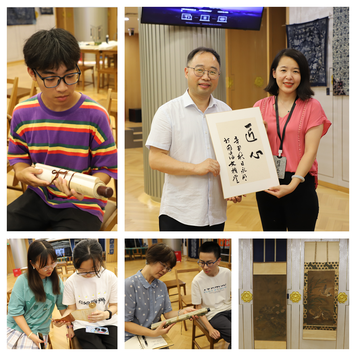 结合讲座内容,费永明老师带来大量珍贵的古代书卷和绘画,包括唐宋时期的珍贵卷轴,明代原装原裱的珍贵古画以及日本同时期的贵族装裱古画,明代文征明《致士奇太史札》、明代首辅徐阶的《致唐顺之信札》卷、元明间谱牒文献《新安朱氏谱系图》卷、宋代查元方书法《丁氏像赞》卷和唐人写经《大波若波罗蜜多经》(第一卷)等不同形制的修复作品,堪称“移动的小型博物馆”,引起了老师与同学们极大的兴趣。亲眼可见,亲手可触的古书画原作,不同朝代不同形制的装裱形式和特点,让师生近距离感受到了高超的修复手艺对古代艺术品的延续保护和价值提升所发挥的作用。