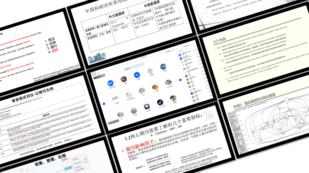 第一讲:基于文本挖掘的文献筛选方法及工具,殷嘉辉老师讲解了进行引文分析的必要性和优势,并介绍了基于R语言的文本挖掘和统计机器学习工具。 第二讲:核心期刊与论文写作投稿,刘玉红老师介绍了常用的核心期刊查询系统、中外文核心期刊评价指标,JCR期刊分区与中科院期刊分区的区别。 第三讲:论文投稿中OA期刊选择的问题探讨,张轶群老师从OA期刊的历史由来、发展现状、投稿中OA期刊的辨别和选择三个方面,系统梳理了OA期刊的特点。 第四讲:文献管理软件(EndNote、Zotero等)在科研、学习中的应用,王爽快老师对比了文献管理软件核心功能异同,讲解了EndNote收集、管理、插入和编辑参考文献方法。 第五讲:文献分析软件HistCite在科研过程中的应用,张轶群老师讲解了HistCite导入文献、获取数据、设置参数、计量分析、可视化图谱等使用方法。 第六讲:学术诚信与文献引用规范,王爽快老师从学术诚信、引用原则、常用参考文献格式、著录工具、常见问题等介绍了文献引用规范。