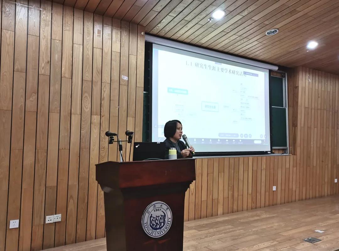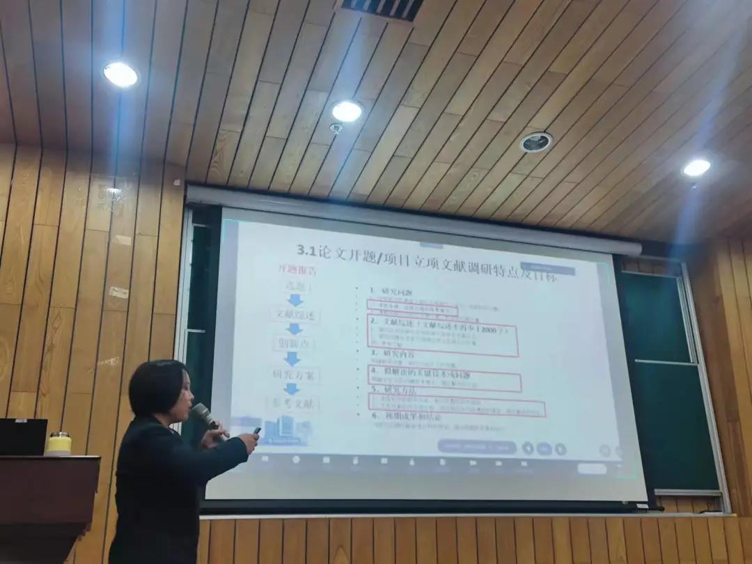 刘玉红主要从“研究生学术生涯与文献调研关系”“如何快速锁定研究领域”“如何高水平完成论文开题和项目立项”等方面展开讲解,为同学们绘制了一张从科研小白成长为科研大神的“蓝图”。 首先,研究生生涯的学术内容主要包括学术论文写作及科研项目研究。研一阶段的主要任务是熟悉自己的研究领域,主动探索并尝试提出学术问题,通过完成课程作业与参与课题项目来锻炼实践能力。同时,系统的学术体系建立绝非一蹴而就,广泛的文献阅读及调研有效地帮助我们建立专业领域的全局观,进而帮助我们提出具有开拓性的创新思想。此外,她还强调要培养“钉子精神”,抓住问题本质进行深入研究,勇于寻求创新。