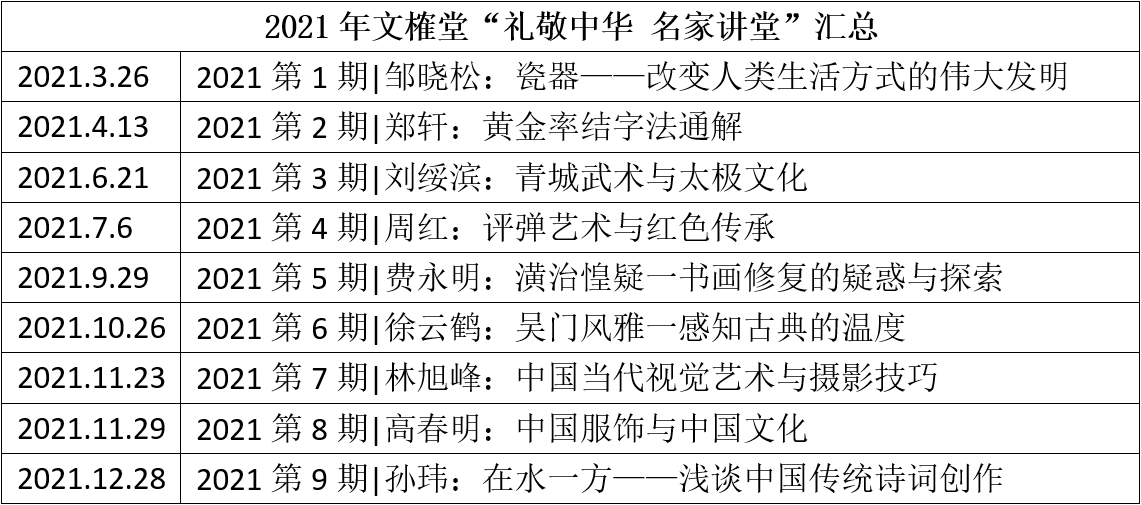 都让人欢欣雀跃 当期末的喧嚣归于寂静 当新春的钟声慢慢临近 无论你仍在校园的幽悄之中蓄势待发 还是你已在乡音的怀抱之中宁欣喜悦 回首这一年 文榷堂和你一起走过的许多时刻 浓缩着我们用勇气,青春和汗水 热情拥抱着的2021! 2021年文榷堂充分发挥嘉定校区的区位优势,立足师生需求,通过部门合作,围绕五育并举,以“传统博雅、山河筑梦、国际融合、科艺同源、芥舟济艺”为主旨,推广中华优秀传统文化、革命文化和社会主义先进文化,推广学科文化及海派文化,传承同济精神,开展了一系列文化育人工作。文榷堂全年主办文化展览10次、主题书展3次、协办展览4次;主办“礼敬中华 ,名家讲坛”9次,其他文化讲座14次;文化课堂1种;嘉定校区教师文化沙龙8次、师生文化雅集26次、同济墨西哥日嘉定校区专场、中意文化节嘉定校区专场2次、“端午雅韵”“中秋雅赏”等传统文化生活节2次,“同迎国庆 济承文化”国庆系列雅集4次、提供会议支持12次,举办“国家级非物质文化遗产十竹斋木版水印创作工坊”1次;线上推出“文榷日历”“嘉书有约”“济语大师”等文化专栏,服务师生5000余人,丰富了嘉定校区师生的文化生活,扩大了同济大学的文化辐射力,形成了良好的文化育人环境,成为嘉定校区文化建设的重要阵地。