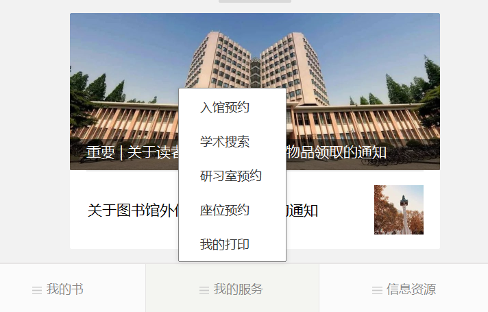 1. PC端 进入图书馆主页,通过“读者服务”——“读者入馆预约” 进入预约页面。 2. 移动端 步骤1. 关注“同济大学图书馆”微信公众号并按提示进行身份绑定(原同济本升硕、硕升博学生需要解绑原学号重新绑定新身份)。 步骤2. 点击“我的服务”——“入馆预约”功能键,选择本地校区图书馆进行入馆预约操作。