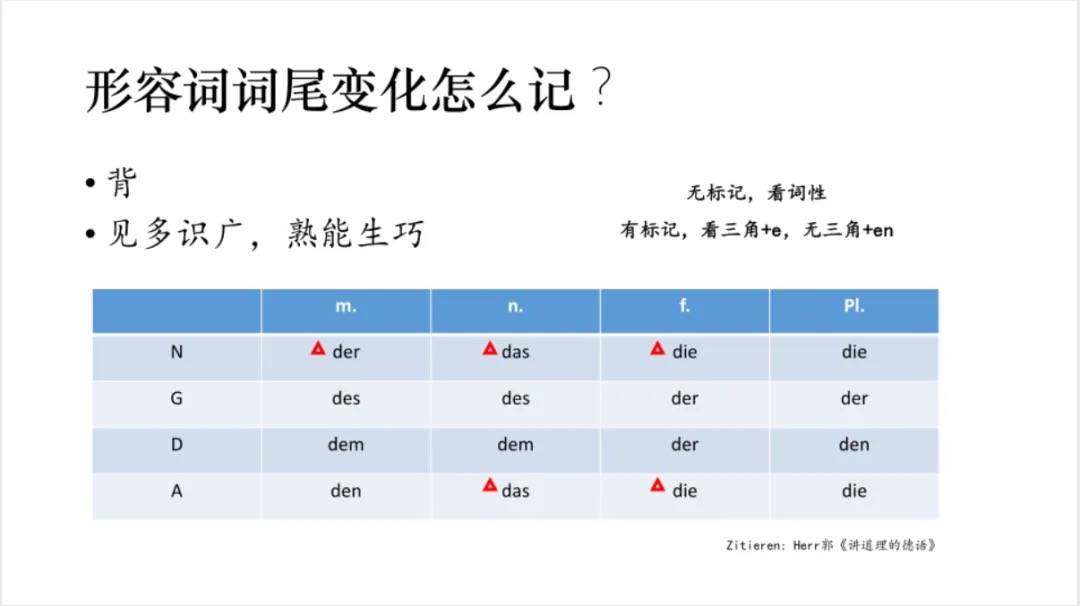 (图片来自郑晓晓的课件) 在前面的轻松互动之后,下面的教学环节便进入了德语经验分享环节。余黄蕾向大家介绍了自己学习德语的心得体会,干货满满。她着重向大家讲解了有关身形、外貌的修饰词、形容词词尾的变化等学习小技巧。她通过梳理德语学习的内在逻辑,化繁为简,将繁杂的知识点变成一张张可对应的表格,让在线的同学们一学就会。 (图片来自余黄蕾的课件)