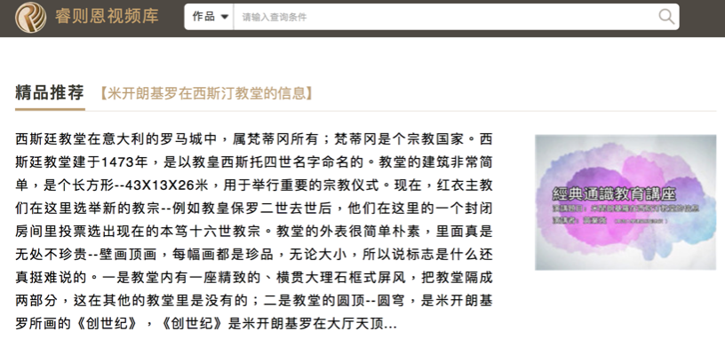 睿则恩视频分为精品课程、学术演讲、技能培训、科学技术、人文社科、健康医药、党政教育、经典影视八大栏目,涵盖理、工、农、医、人文、社科等教学科研领域的各个学科,收录著名学者的优质视频学习资源。