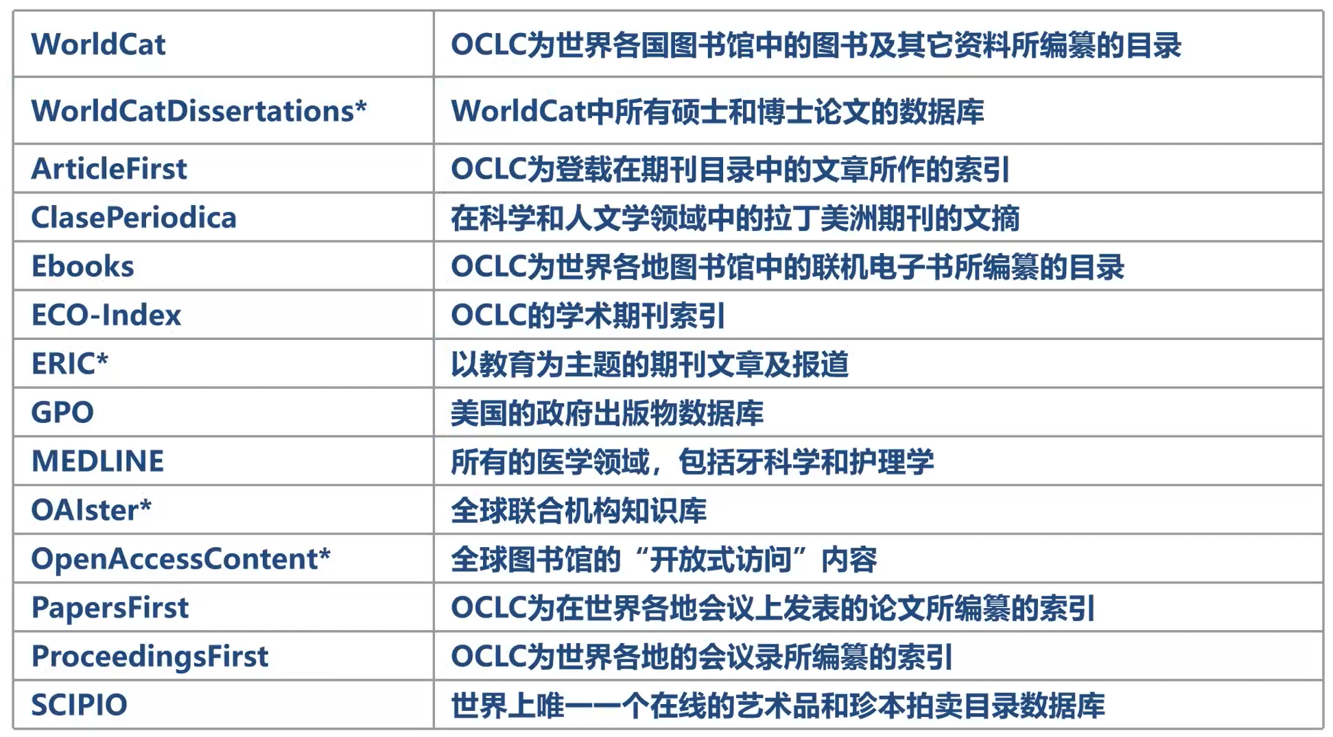 3. 子库推荐 1)14个子库里最有影响的是一个由世界范围内的近两万家图书馆参加联合编目的WorldCat数据库。WorldCat是唯一一个全球图书馆联合目录,也是世界上最大的外文著作书目和馆藏信息数据库,WorldCat的5.2亿条记录助您轻松检索全球馆藏资源。 2)OpenAccessContent数据库一站式检索并获取Directory of Open Access Journals、HBO Kennisbank、JSTOR、OCLC、Open Access Publishing in European Networks (OAPEN)、Public Library of Science等1000余家内容提供商的8400余万条开放获取记录。涵盖了数字化图书与文章、同行审阅的期刊、学术博客、文学期刊、学术专著、研究报告、第一手资料等多种类型。 3)WorldCatDissertations数据库可以获取麻省理工、斯坦福、哈佛、耶鲁、剑桥、牛津等知名大学的2650多万篇硕博士论文文摘和约100万篇全文。 更多详情 OCLC官方网址https://www.oclc.org/zh-Hans/membership/institutions.html 资源语言:外文 资源类型:综合 ---【lib•致理】理科师生小调查--- 老师 学生