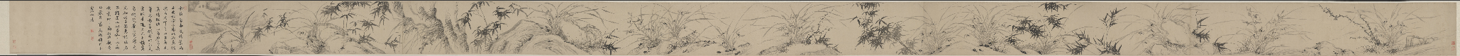 文徵明其人洒脱自如,其画恣意纵横,曾在他的巨幅《兰竹图》中自题:“余最喜画兰竹”,性情与才情展露无遗。 《兰竹图》文徵明自题 《兰竹图》 明 文徵明 纸本 墨笔 纵26.8厘米 横730厘米 现藏北京故宫博物院