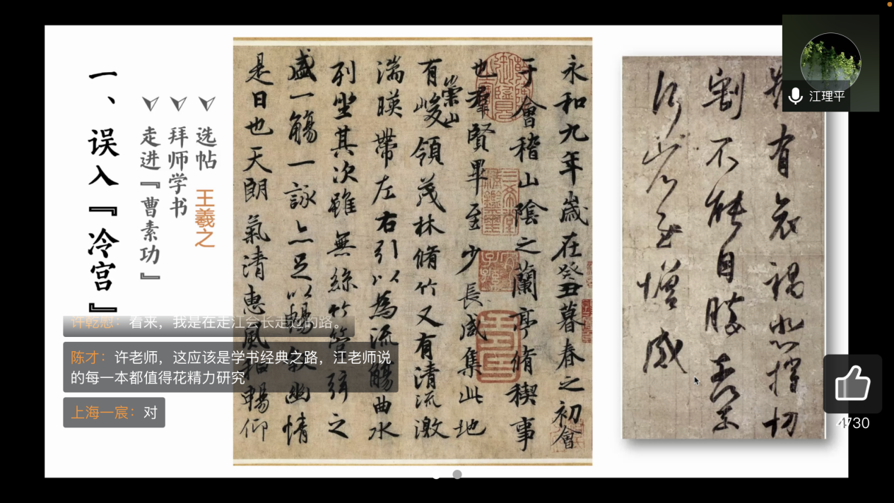 江老师将他从懵懂少年到接触书法、拜师学书,再到选帖苦练,进而学习绘画的50多年的求学历程娓娓道来。结合自己研习书法的亲身经历,江老师还向大家一一解读了颜真卿、王羲之、智永、米芾、赵孟頫等名家的行书与楷书作品各自特点。