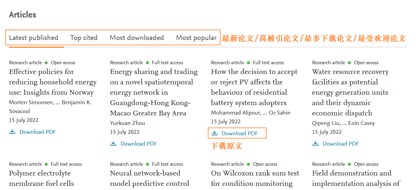 也可以在Articles一栏查看该期刊的最新论文/高被引论文/最多下载论文/最受欢迎论文,选择某一篇文献,可进行详细阅读和使用。