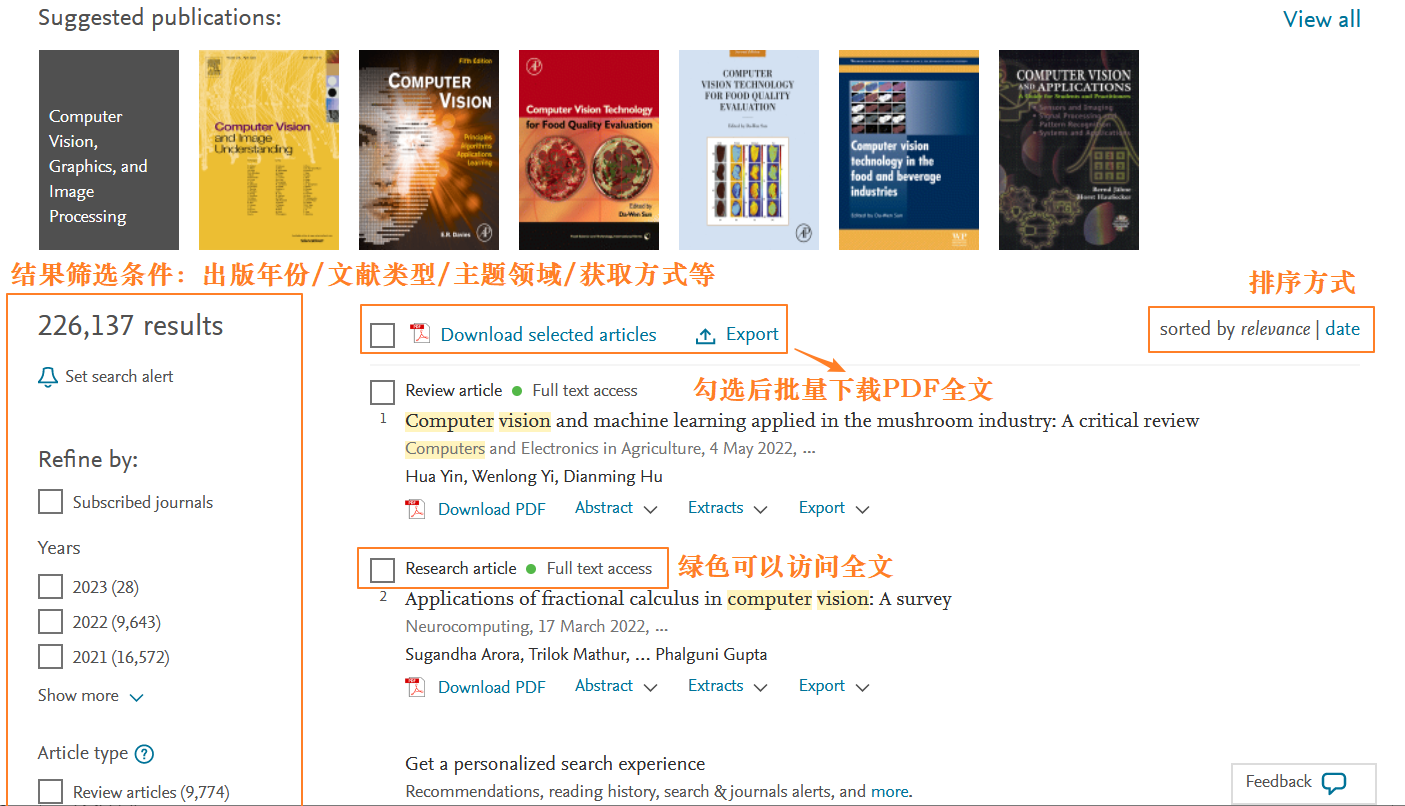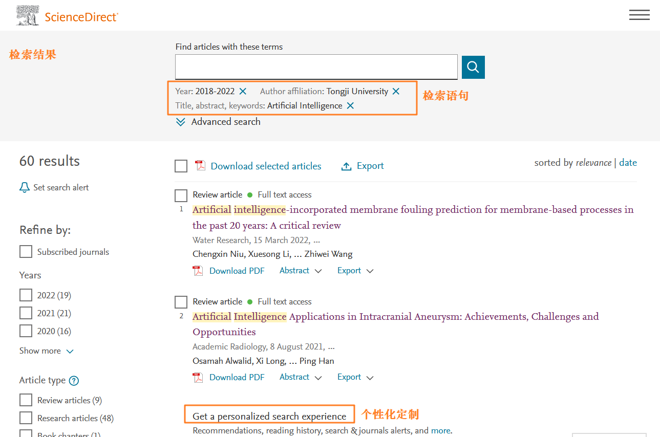 检索出来的结果如下图所示,可以通过左侧栏进行类型筛选,文献若标识为绿色表示可以访问全文。检索到的文献可以按照年份、文章类型、期刊等条件分类查看,便于了解相关主题的发展趋势和期刊文章,辅助论文投稿和选题。