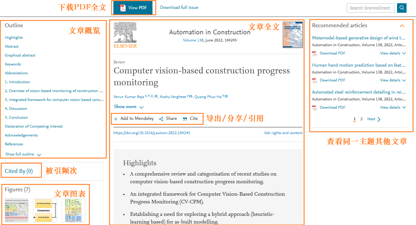ScienceDirect支持对检索到的文献直接进行全文下载、查看摘要,以及输出到相关文献管理软件,便于文献的整理。在文献页面可以查看引文标题、作者、期刊等信息,不仅可以直接链接到全文,也可以直接查找引用文献在文章中的位置。