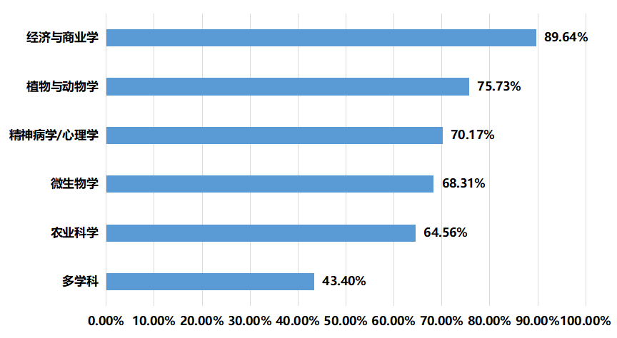 据科睿唯安ESI(基本科学指标)数据库2022年5月12日发布的最新数据(数据量统计时间范围为2012年1月1日-2022年2月28日)显示,我校进入ESI世界前1%的学科共有15个,它们是工程学、材料科学、环境/生态学、计算机科学、临床医学、化学、生物学&生物化学、地球科学、社会科学总论、药理学&毒理学、分子生物学&遗传学、神经科学&行为学、免疫学、数学和物理。 表:我校进入ESI前1%学科情况 我校进入ESI世界前1%的15个学科中,工程学、材料科学、环境/生态学、计算机科学和临床医学进入世界前1‰。其中,环境/生态学和计算机科学首次进入世界前1‰。化学、生物&生物化学、地球科学、社会科学总论和药理学&毒理学进入世界前3‰。其中,药理学&毒理学首次进入世界前3‰。多个学科进步明显。 我校未进入ESI前1%的学科接近程度(等于我校该学科被引频次/进入ESI前1%学科被引频次阈值)如下图所示。其中,经济与商业学、植物与动物学、精神病学/心理学、微生物学、农业科学和多学科均进步显著。 图:我校未进入ESI前1%的学科接近程度