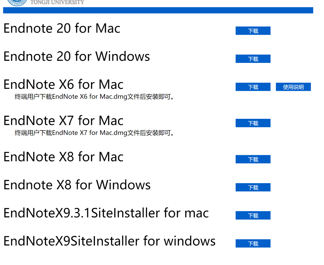 下载方式一: 登录同济大学图书馆主页:www.lib.tongji.edu.cn,找到“科研支持“栏目下的“科研工具”,即可看到EndNote软件的下载地址。 下载方式二: 1.登录同济大学图书馆主页:www.lib.tongji.edu.cn,在数据库导航列表中查找EndNote。