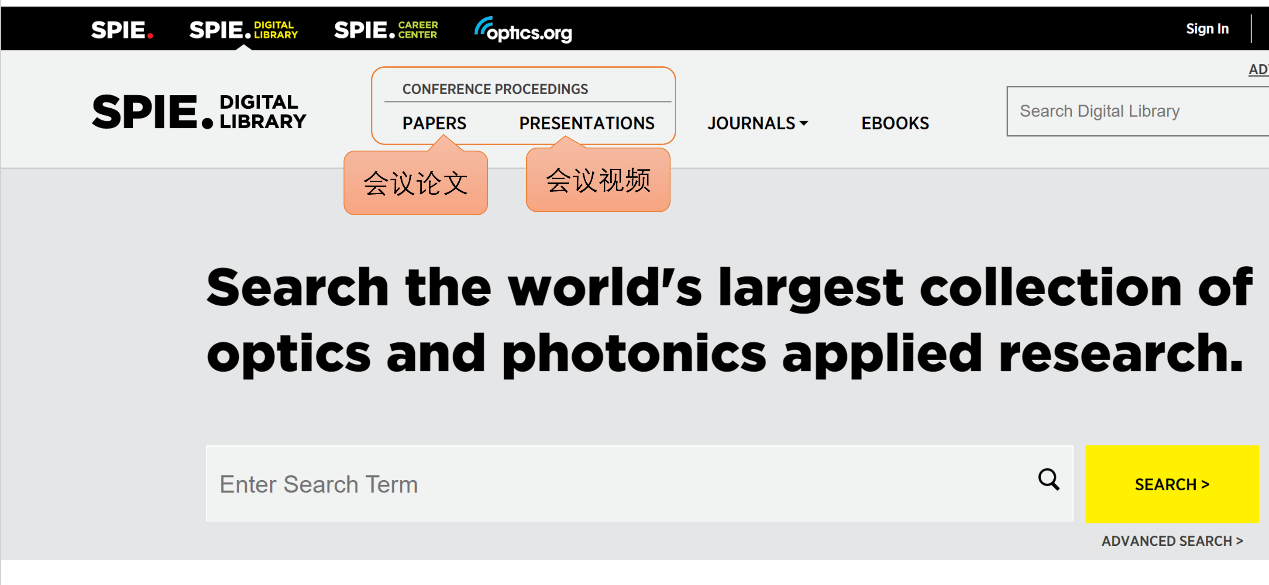 《Journal of Micro-Nanolithography MEMS and MOEMS》期刊已改名为《Journal of Micro/Nanopatterning, Materials, and Metrology》,详见:https://www.spiedigitallibrary.org/journals/journal-of-micro-nanopatterning-materials-and-metrology。但请注意,目前在SCI和JCR数据库还需用老刊名《Journal of Micro-Nanolithography MEMS and MOEMS》检索。 三、SPIE会议SPIE每年主办召开300多场国际性和地区性学术会议和展览,所形成的会议录文献反映了光学工程应用领域的最新进展和动态,也汇集了遥感、机器人、图像处理和计算机等方面的最新研究成果。 会议录发表速度快,提供科学与技术(特别是技术方面)最新的研究成果,也是专利文献中引用最多的文献类型之一。对于计算机、电子等工程领域,会议录被参考的机会大于期刊。在SPIE会议上提交的原始研究论文可在会议后2至4周在SPIE数据库中发表。 SPIE数据库包含的会议录目前已有11760多卷,每年新增300卷到350卷。至今有超过28万篇的会议文章被CPCI-S(Web of Science平台上的科学技术会议录索引)收录、超过47 篇文章被EI(Engineering Village的Compendex数据库)收录。 SPIE数据库同时还包含了一个会议视频\音频板块,可以点击数据库主页“PRESENTATIONS”栏目查找相关会议的主旨报告等视频内容,该板块收录多达29000个与会议录相关的演讲视频及讲义PPT,我校师生可免费在线观看,但不能下载到本地。 大家可以通过中文视频(链接地址:https://mp.weixin.qq.com/s/wFg2BuGs8IBvxdZWSUO_-g)深入了解SPIE数据库的使用技巧,包括如何进入数据库,如何检索、下载、使用个人账户等特色功能,助力您的科学研究。