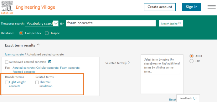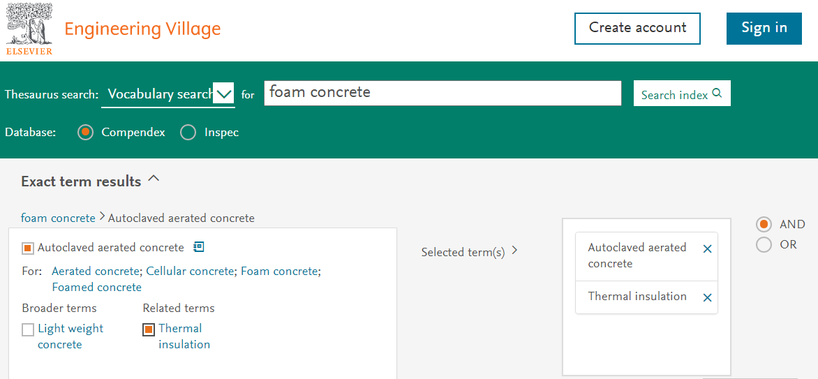 点击受控词“Autoclaved aerated concrete”,我们又找到了所有与“Autoclaved aerated concrete”相关的受控词“Thermal insulation”(保温隔热),以及更广义的受控词“Light weight concrete”(轻质混凝土),同时我们也发现更多相关词,图中For后面词汇代表同义的不同表达,可用其他数据库扩充同义词检索。如下图所示。