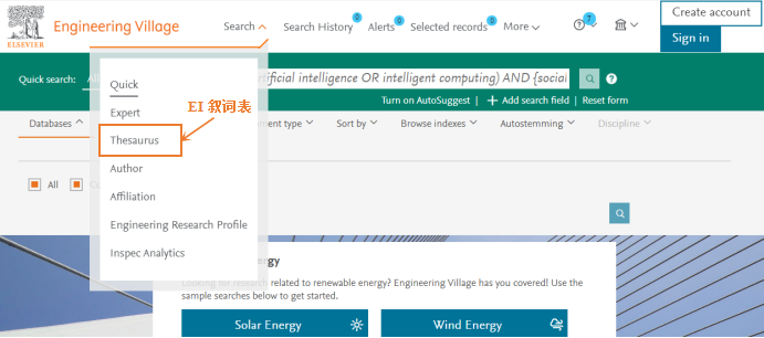 二、叙词表检索 在学习了叙词表的理论知识后,让我们通过案例来了解一下如何通过叙词表实现工程领域相关研究的精确检索吧。 案例:我们想了解关于“泡沫混凝土”方面的研究文献。 先来看一下叙词表检索打开方式:单击页面顶部的“Search”,打开下拉菜单,选择“Thesaurus”就会进入叙词表搜索页面。 下面以EI-Compendex的叙词表为例进行案例演示。