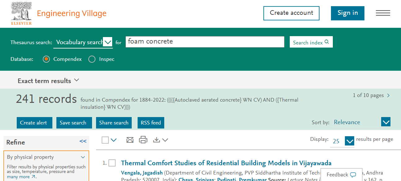 接下来详细了解“泡沫混凝土在保温隔热”方面的研究,我们勾选“Autoclaved aerated concrete”和“Thermal insulation”两个受控词,并选择布尔逻辑运算符“AND”连接这两个词,点击“搜索”,即可检索到相关文献241条,如下图所示。 总结一下: