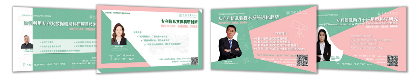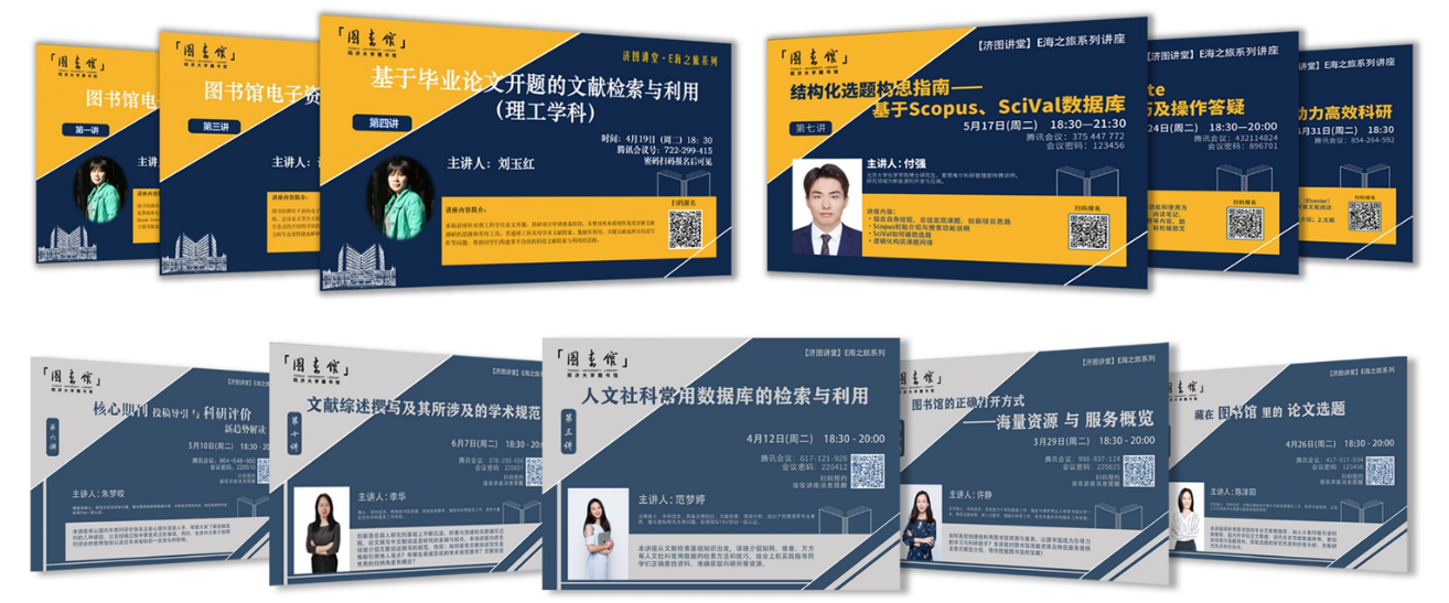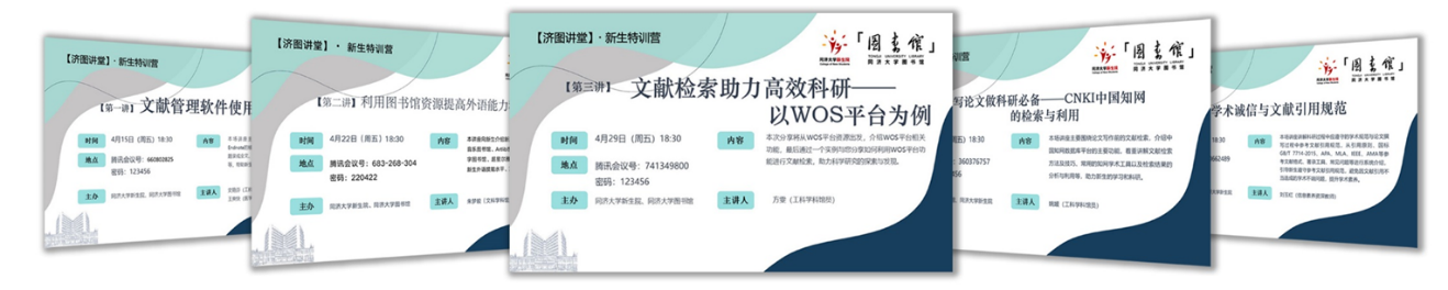 系列讲座回顾 E海之旅系列 4·26世界知识产权日系列 新生特训营系列 助力“双创”系列 学院定制系列 【济图讲堂】讲座内容围绕文献检索、文献调研、数据库使用、学术规范、文献管理软件等主题,以满足师生需求为目标,有针对性开展培训。疫情阻挡 了师生们高涨的学习热情,我们每周定期云中相聚,共度美好时光,在这里我们有收获、有感悟、有成长。