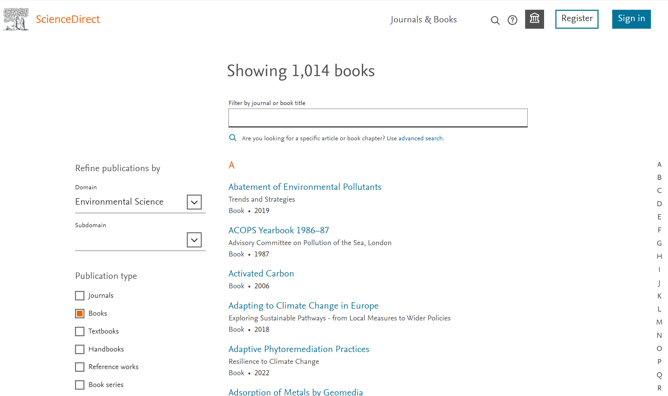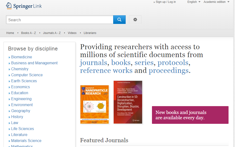 1. Springer Nature/施普林格·自然电子图书 施普林格·自然(Springer Nature)是全球最具综合性的在线科技电子图书系列。其中内容包含专著、教科书、手册、图集、参考工具书、丛书等。图书馆购买了SpringerLink平台逾11万册电子图书,包含原帕尔格雷夫·麦克米伦(Palgrave Macmillan)电子图书以及2007年之后出版的施普林格(Springer)电子图书,全面覆盖除能源之外的所有学科。 环境学科类内容覆盖:电子图书4061种,其中Environmental Management 1079种、Sustainable Development 851种、Waste Water Technology / Water Pollution Control / Water Management / Aquatic Pollution 641种、Environment,general 488种、Ecotoxicology 476种等。 链接地址:https://link.springer.com/ 提示:施普林格·自然电子图书与期刊同在其SpringerLink平台,提供协同访问。 2. Elsevier eBook/爱思唯尔电子图书 爱思唯尔(Elsevier)电子图书涵盖自然科学与工程、生命科学、健康科学、社会科学与人文科学4大类24个学科领域,既有专业基础理论,又有实际应用案例;既有专题研究成果综述,又有最新科研进展,以及跨学科研究内容,揭示了这些学科的学术成就和发展情况。这些图书深受行业认可和信赖,为教学和科研以及学科建设和发展提供权威可靠、高质量的内容资源。图书馆近年来以学科包的形式陆续购置了2013年至今出版的理、工、医学门类上万册电子图书,平台可以实现按学科专辑浏览,在Life Sciences-Environmental Science下可以浏览图书、参考工具书等。 环境学科类内容覆盖:电子图书1014种、教材20种、参考工具书44种。 链接地址:https://www.sciencedirect.com/ 提示:爱思唯尔电子图书与期刊同在其ScienceDirect平台,提供协同访问。 3. Wiley eBook/威立电子图书 威立(John Wiley & Sons,简称Wiley)是一个具有超过200年历史的全球知名出版机构,与超过800家专业学协会合作,出版图书品质较高。Wiley电子图书收录了包含人文社科、理工科、商科等多学科领域的2万多部专著,包含来自文学、经济学、生理学、医学、物理、化学与和平奖等各类别的400多名诺贝尔奖获得者的著作。目前,我校师生可访问该平台全部专著图书,可以按学科浏览。 环境学科类内容覆盖:Ecotoxicology & Pollution Science 33种、Environmental Change 52种、Environmental Chemistry 457种、Environmental Management, Policy & Planning 84种、Environmental Microbiology 25种、Environmental Science 208种等。