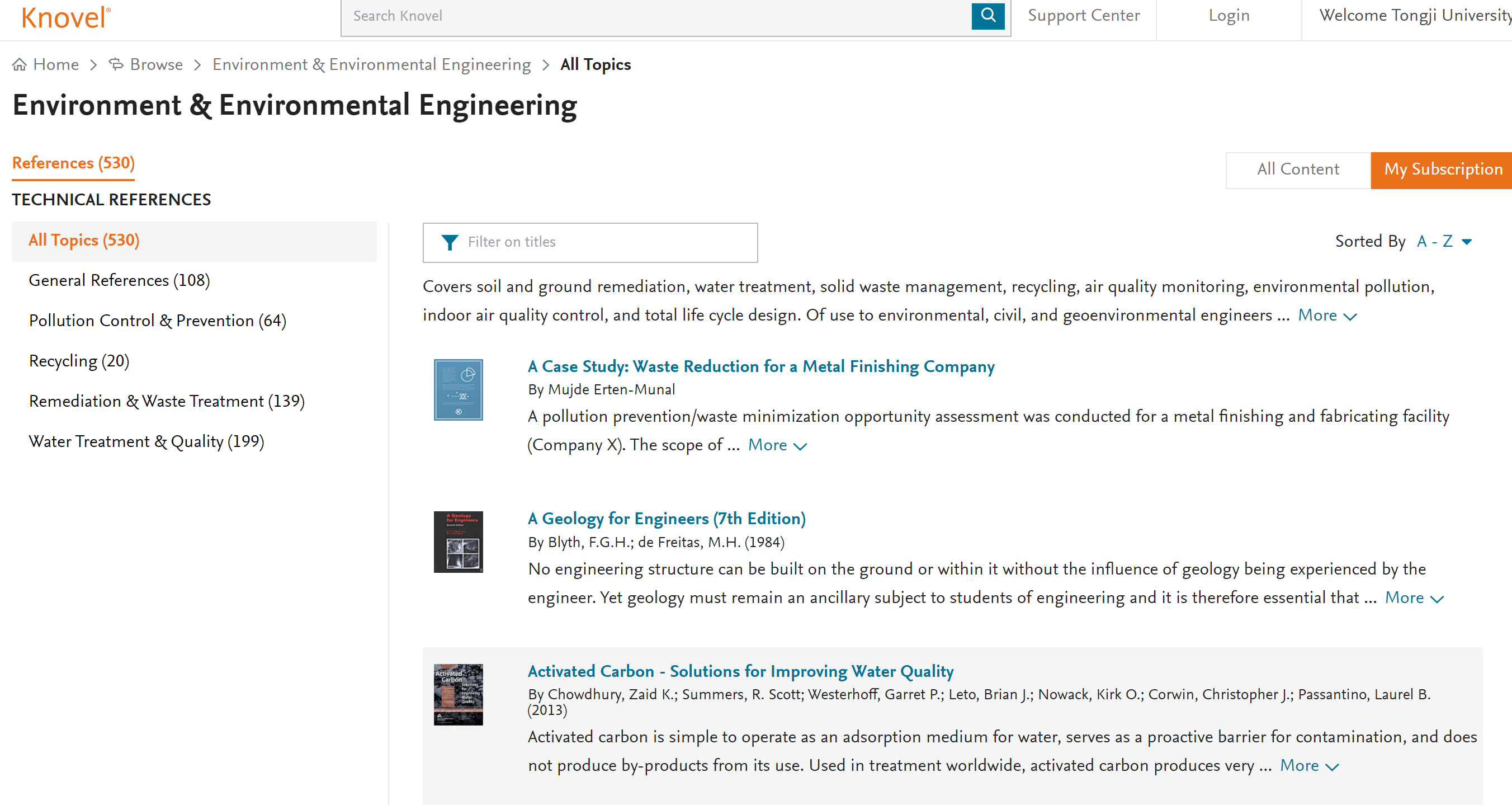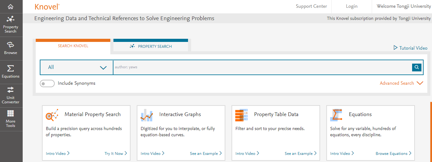 5. Knovel数据库 Knovel数据库是爱思唯尔(Elsevier)旗下的工程及理工学科解决方案产品,提供10969册左右电子书的全文,来源于Elsevier、美国航空航天学会(AIAA)、美国化学工程师协会(AIChE)、美国采暖、制冷与空调工程师学会(ASHRAE)和美国土木工程师协会(ASCE)等150余家出版社,提供7600万个数据点(指材料的性能)、2500个方程式、10多万种互动表格、图表。图书馆购买了该库的全部内容,包括37个主题领域和6个经典合集的参考工具书原文、互动图表。 环境学科类内容覆盖:电子书530种,其中General References 108种、Pollution Control & Prevention 64种、Recycling 20种、Remediation & Waste Treatment 139种、Water Treatment & Quality 199种。 链接地址:https://app.knovel.com/kn