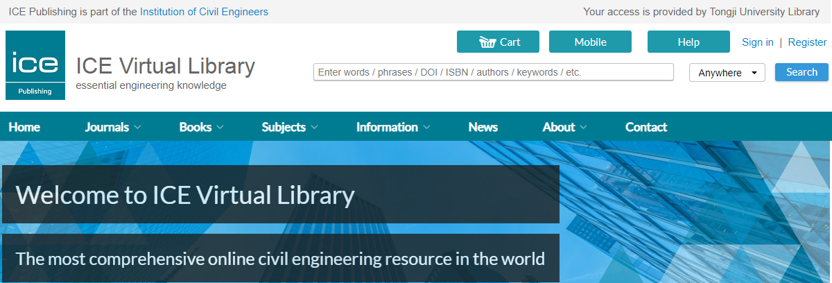 链接地址:https://onlinelibrary.wiley.com/ 提示:Wiley电子图书与期刊同在其Wiley Online Library平台,提供协同访问。 4. ICE/Institution of Civil Engineers/英国土木工程师协会电子书 英国土木工程师协会(ICE)电子书数据库由英国土木工程师协会(Institution of Civil Engineers,简称ICE)出版,ICE是世界上历史最悠久的专业工程机构,有近200年的历史。英国土木工程师协会出版社拥有世界上最大的土木工程电子图书集。ICE电子图书集覆盖土木工程领域每一个主要学科,涵盖13个领域,图书馆订购了约1520种电子图书,超过40 页。 环境学科类内容覆盖:环境图书集129种、水与废水图书集211种等。