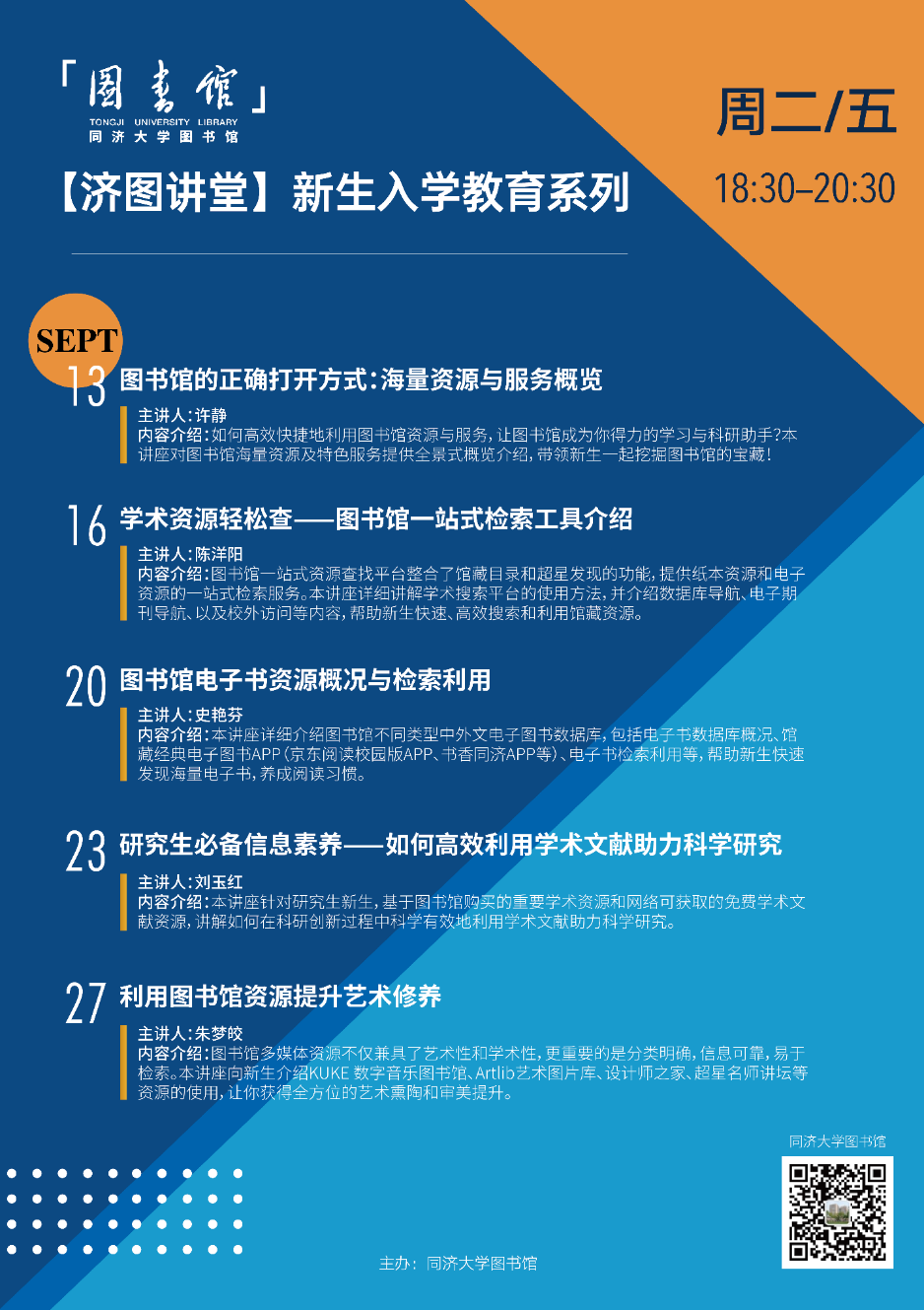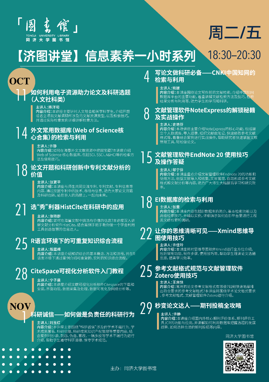 9-11月【济图讲堂】信息素养讲座清单如下,请关注图书馆微信公众号讲座通知。
