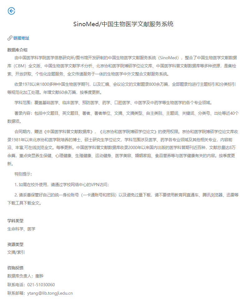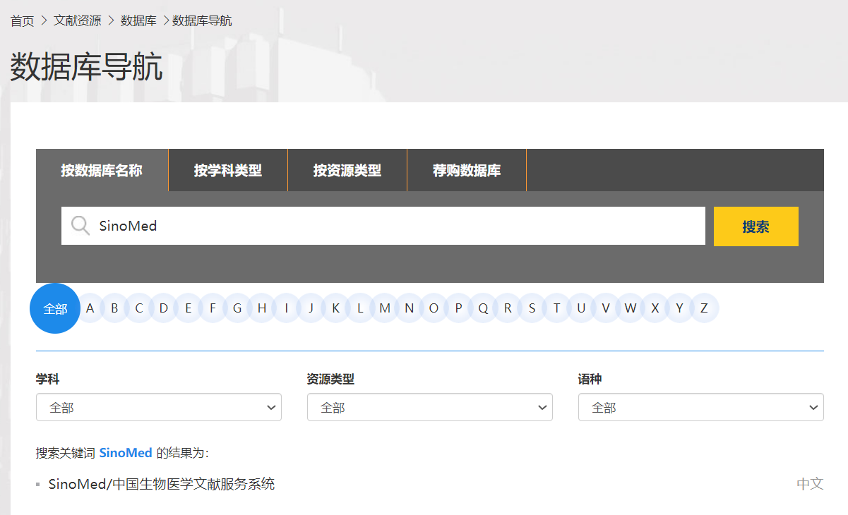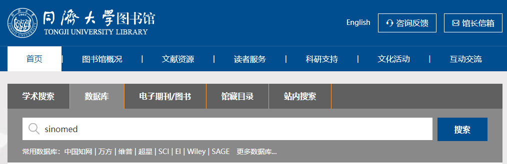 图书馆馆藏数据库资源均可在同济大学图书馆主页数据库导航栏目找到。以SinoMed数据库为例,在检索框中输入“SinoMed”点击搜索,可看到该数据库信息。