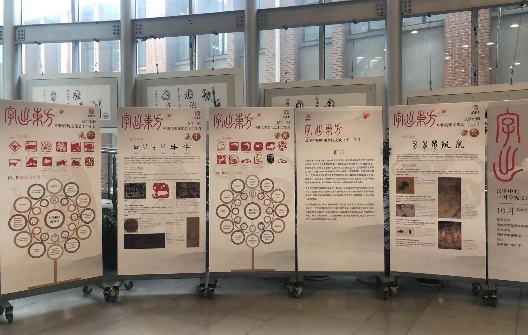为配合第25届全国推广普通话宣传周同济大学系列活动,由同济大学党委宣传部指导、同济大学汉语言文字办公室和同济大学图书馆联合主办的“字出东方——汉字与篆刻文化”系列主题展于2022年9月起在图书馆一楼大厅与十楼闻学堂、瑞安楼一楼大厅展出。本次展览共分为“汉字中的中国传统文化之十二生肖”、“方寸之间——中国印章篆刻文化”、“历代印章篆刻精品赏析”三个部分,展期将持续至12月下旬。