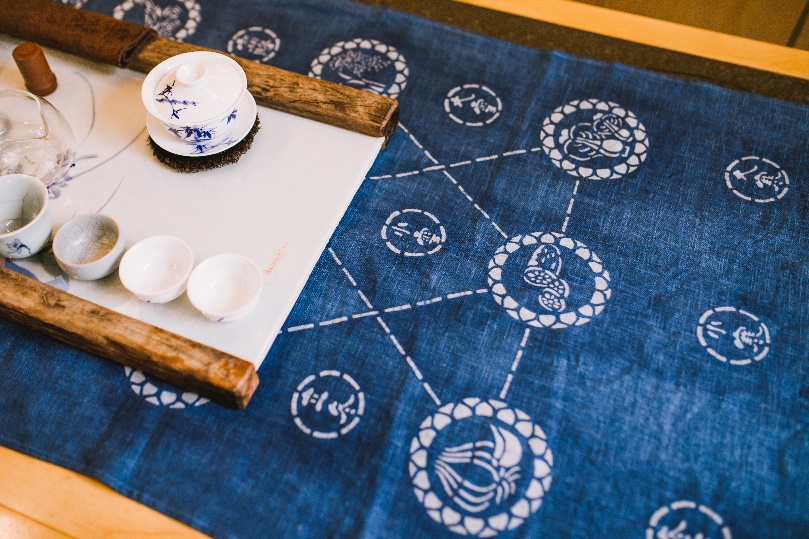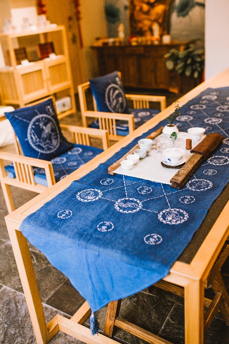 “药斑布”通过织布、刻版、刮浆、染色、刮白、固色、晾晒七道工艺,留下了自然冰纹,形成鲜明的蓝白之美,具有防蛀、防霉等功效,长期储存不褪色,不霉变。800年来,江南的民风民情,幻化成蓝白两色的传统纹饰,又演变出精致文雅的创新产品。