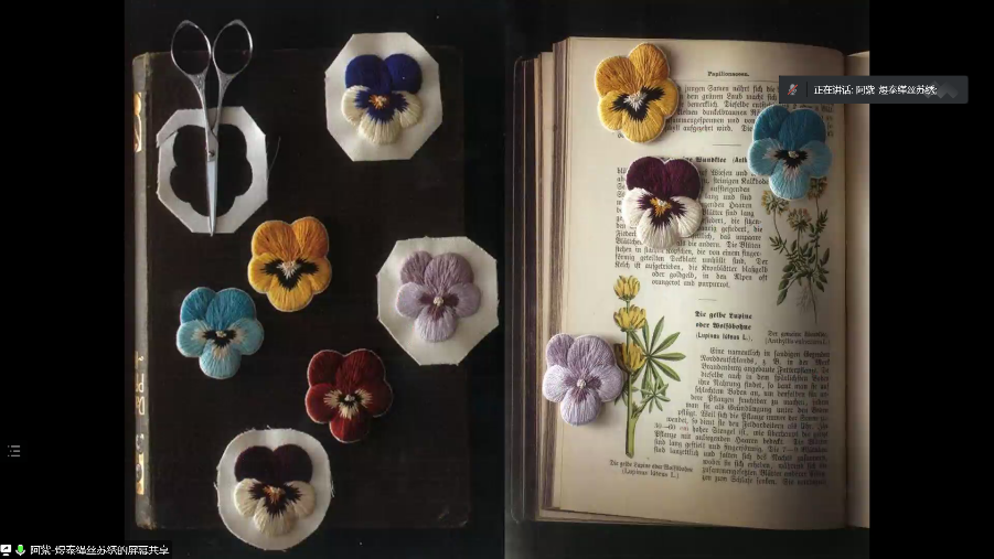 12月8日中午,由德文图书馆主办的“童话森林——苏绣主题文化展”暨师生苏绣实践体验”活动成功在线上举办。 本次活动指导老师为上海市嘉定区非物质文化遗产立项传承人陈碧娴,她七岁起跟随外祖父学习苏绣,集百家之所长,不断探索创新,以画入绣,创造出叶套针、编叠针等独特技法。曾在上海图书馆、上海枫之印画廊举办个人苏绣作品展,刺绣作品作为国礼赠予多个国家。 活动开始前,同学们提前领取了针线和手提包等材料,等待陈老师在云端为大家讲授苏绣知识。陈老师首先向大家展示了一些经典的苏绣作品,并讲解了苏绣针法其中的奥义,随后进入了今天的主线任务——绣三色堇。陈老师展示了多种三色堇作品图片,介绍了刺绣的步骤和技巧,之后便和同学们开始同步刺绣。 由于是第一次接触苏绣,大部分同学需要通过在线语音求助,陈老师便通过手部的特写镜头配以讲解,让同学们跟着她一针针完成了刺绣,大家的手法也随着活动的进行越来越娴熟。 经过此次活动,同学们通过自己手工实践,体验到了苏绣的魅力以及背后需要付出的汗水与努力,德文图书馆今后将继续举办更多文化体验活动,提供文化互鉴、交流的平台。 图文:吴敬 |