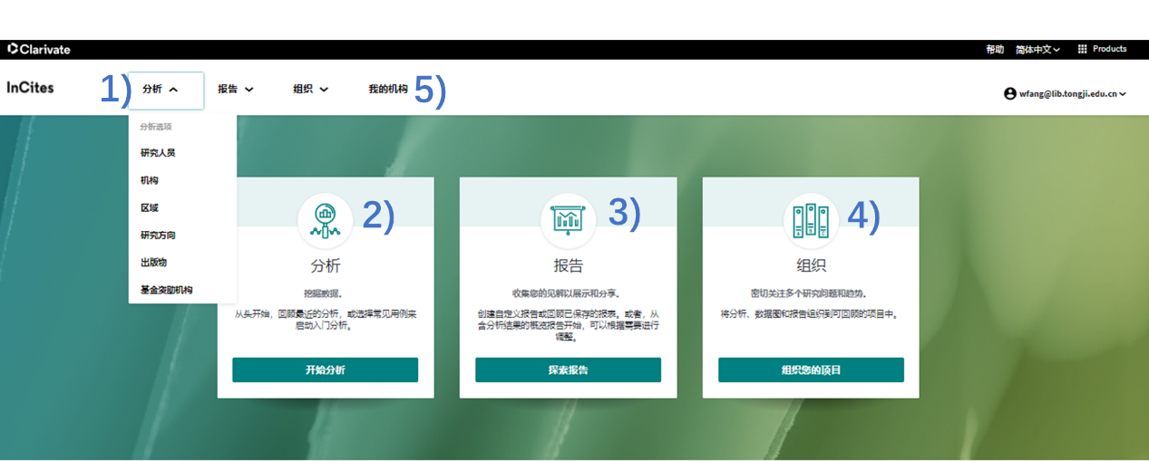 2. 通过“分析”模块快速启动模板化分析功能 3. 通过“报告”模块快速创建数据库内置的报告模板,展现机构、人员、部 门的科研表现、期刊利用率、合作等情况,同时支持创建自定义分析报告 4. 通过“组织”模块管理和使用已保存的工作 5. 点击“我的机构”进入全新模块 My Organization,实现院系、个人科研 数据的精确度量和精准追踪