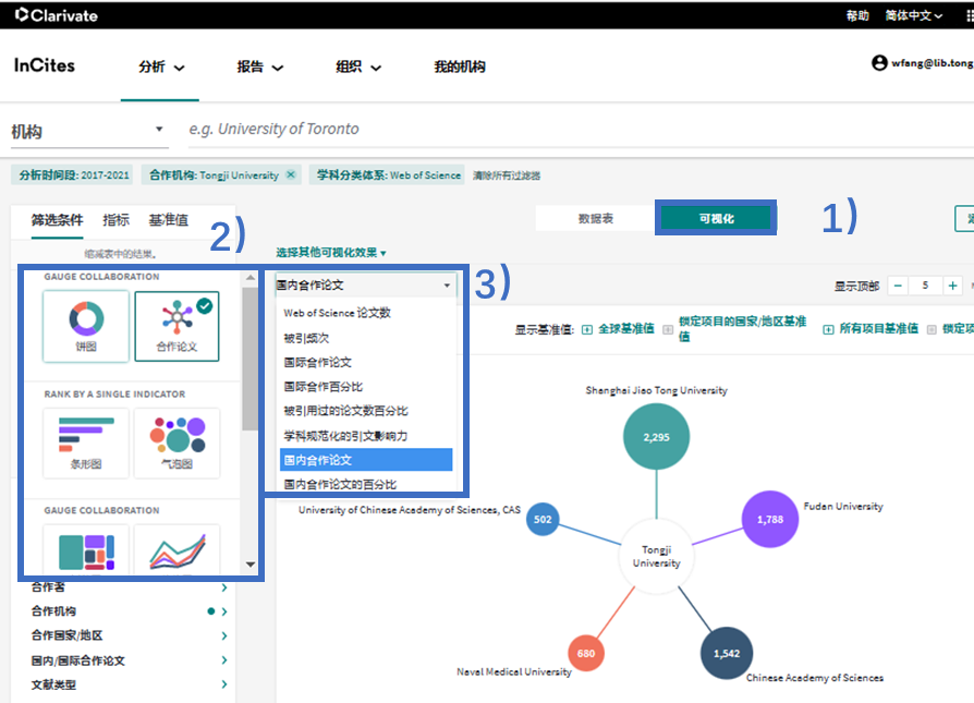 University” 3. 分析设置 1)选择分析时间区间 2) 选择合作分析 4. 可视化设置 1) 选择可视化显示 2) 选择可视化效果 3) 选择显示指标